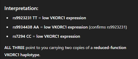 rs9934438 AA → you are likely more sensitive to warfarin → need lower doses.