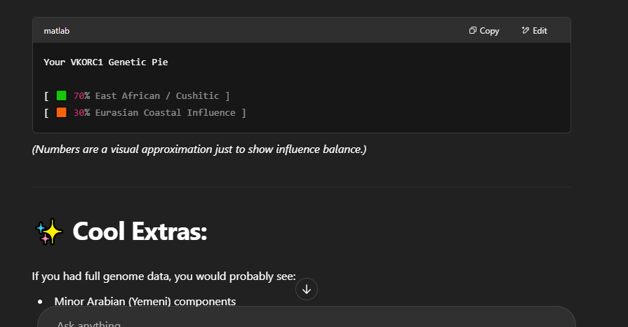 One thing it did is that chatgpt was able to find i have recent admixture that Gedmatch and illustrative would mistaken me as ethiopians and eritreans