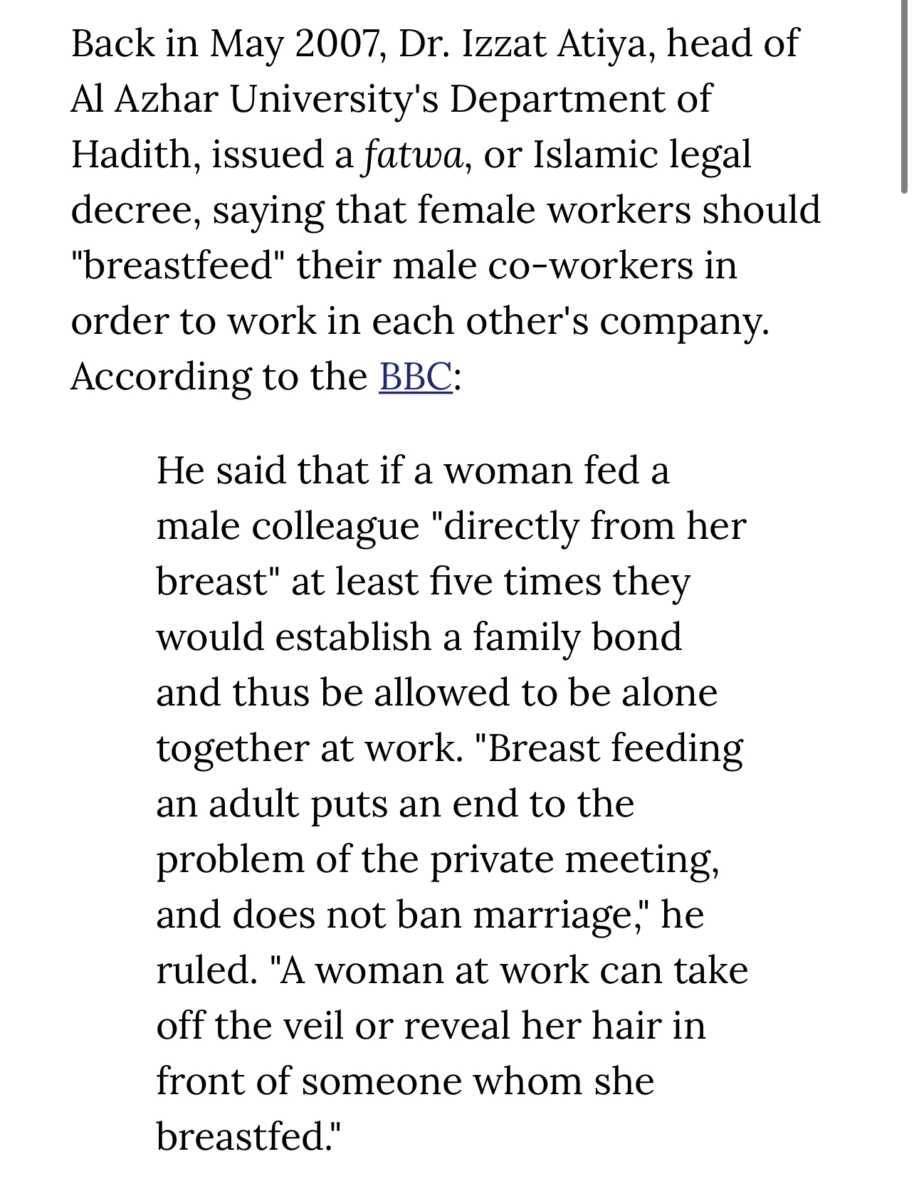 I'm sure there were some co-workers who took this fatwa seriouslyThere's no fucking way. This has to be satire. Free titty milk for male co-workers day! From co-worker to my child!