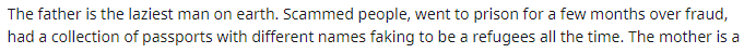 The father is the laziest man on earth. Scammed people, went to prison for a few months over fraud, had a collection of passports with different names faking to be a refugees all the time.
