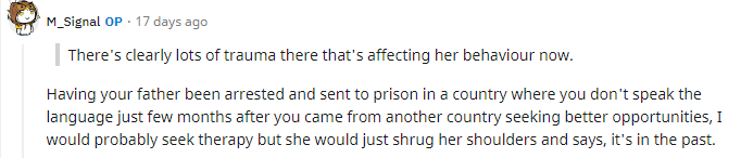 3. The girl came to the country when she was 16 so she couldn't have been the one providing for the family etc. It's evident the family had the means to support themselves prior and most probably after her coming to the country. He calls her mother selfish for expecting her daughter to contribute to their lives ? what is this ? what kind of child doesn't pay the bills or support their family when they come of age ? What about the sacrifices her mother made to raise her ?