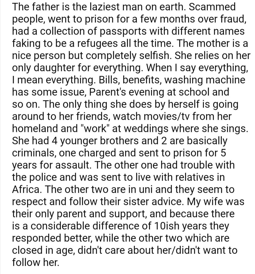 4. You keep on saying he has omitted facts about his own family. How do you know he isn't from a regular normal family? That point doesn't make sense in the slightest. Her family are clearly very dysfunctional. Why are you behaving as though going to prison (once) scamming, fake passports, not working, is normal? The mother is healthy enough to go weddings and SING at weddings but not care about her own children's education?!