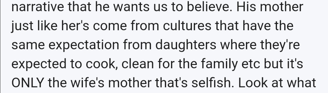 5. The guy clearly without a doubt has more respect towards his family as he didn't disclose their own dysfunctionality & even when he did say something about them he was very selective in his choice of words and only gave out minor details. We don't know the inner details of his family but we do of his wife precisely because it fits the narrative that he wants us to believe. His mother just like her's come from cultures that have the same expectation from daughters where they're expected to cook, clean for the family etc but it's ONLY the wife's mother that's selfish. Look at what he says here