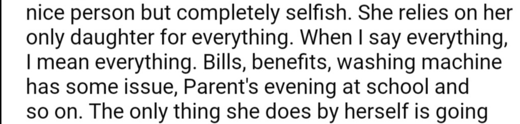 The OP clearly said in plain English may I add that she relies on her daughter for Everything. He even said everything multiple times.