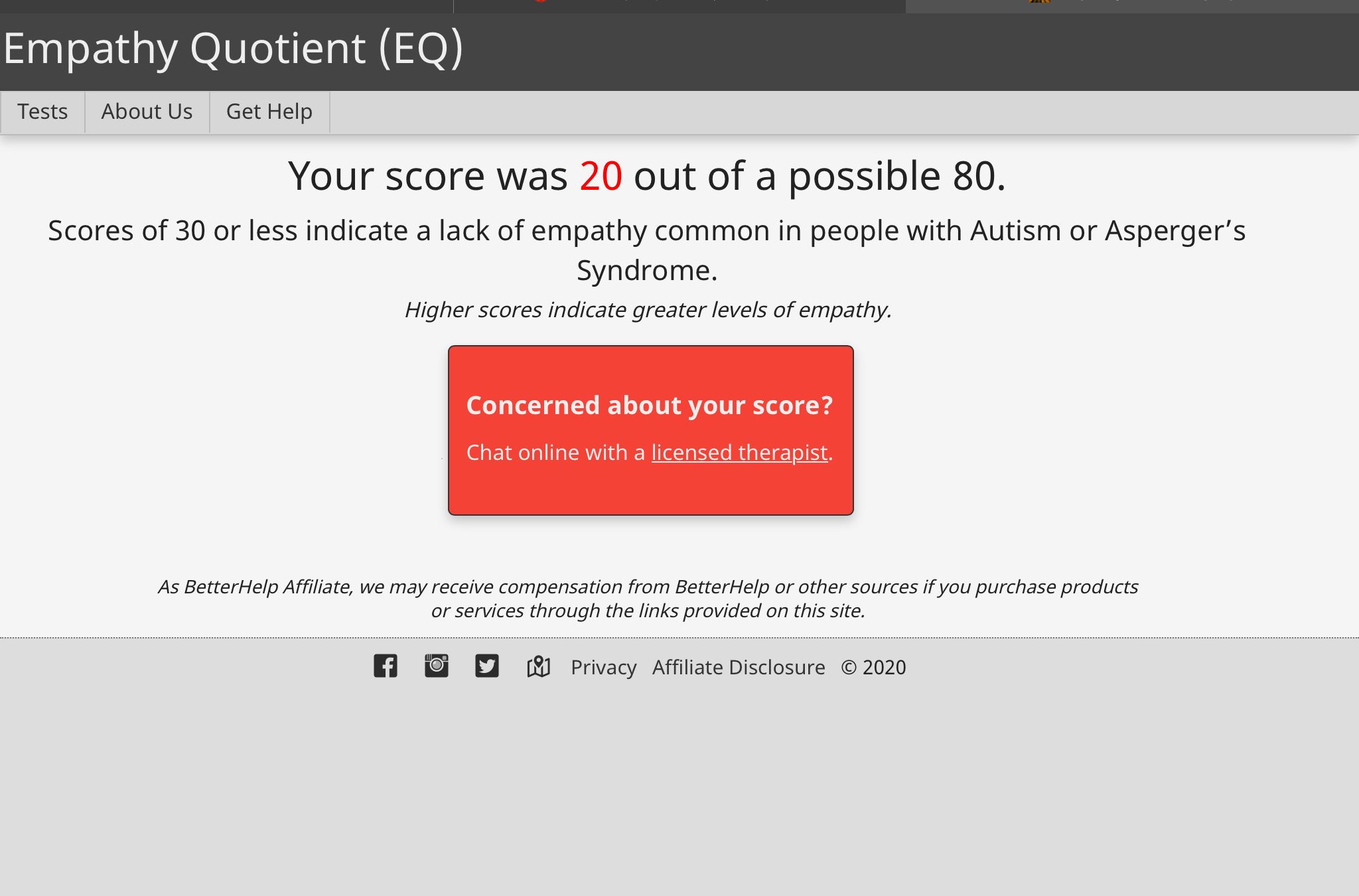 The Empathy Quotient (EQ) is a 60-item questionnaire (there is also a shorter, 40-item version) designed to measure empathy in adults. The test was developed by Simon Baron-Cohen at ARC (the Autism Research Centre) at the University of Cambridge.