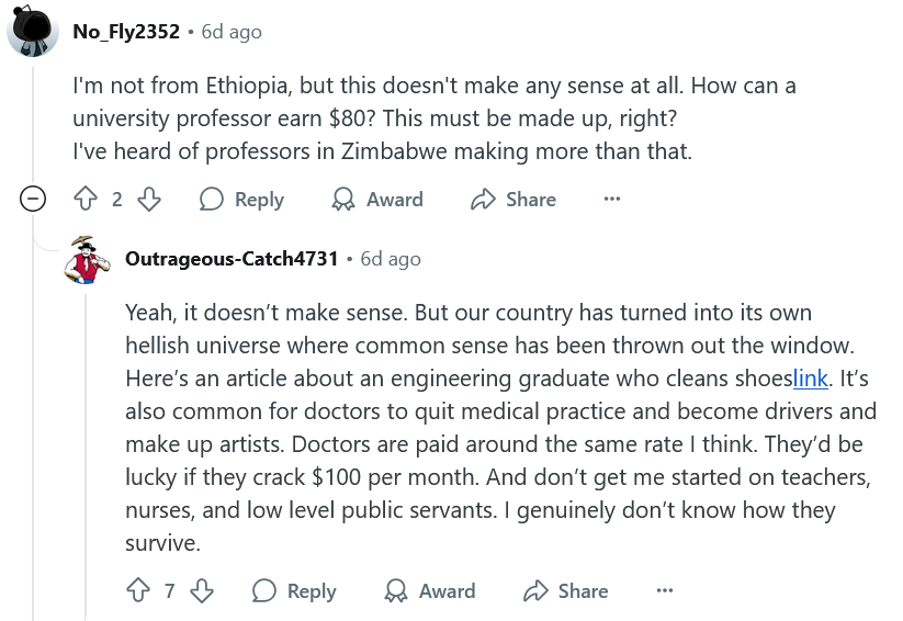 Ethiopians also receive no jobs after graduation so people flee the country. Whereas in Somalia they invested money into creating companies, firms etc, and created job placement schemes for graduates and youth that leave the private technical and university schools. Ethiopia’s government controls most industries, limiting private sector growth. Ethiopians are still poor despite these government policies because the system does not create wealth.