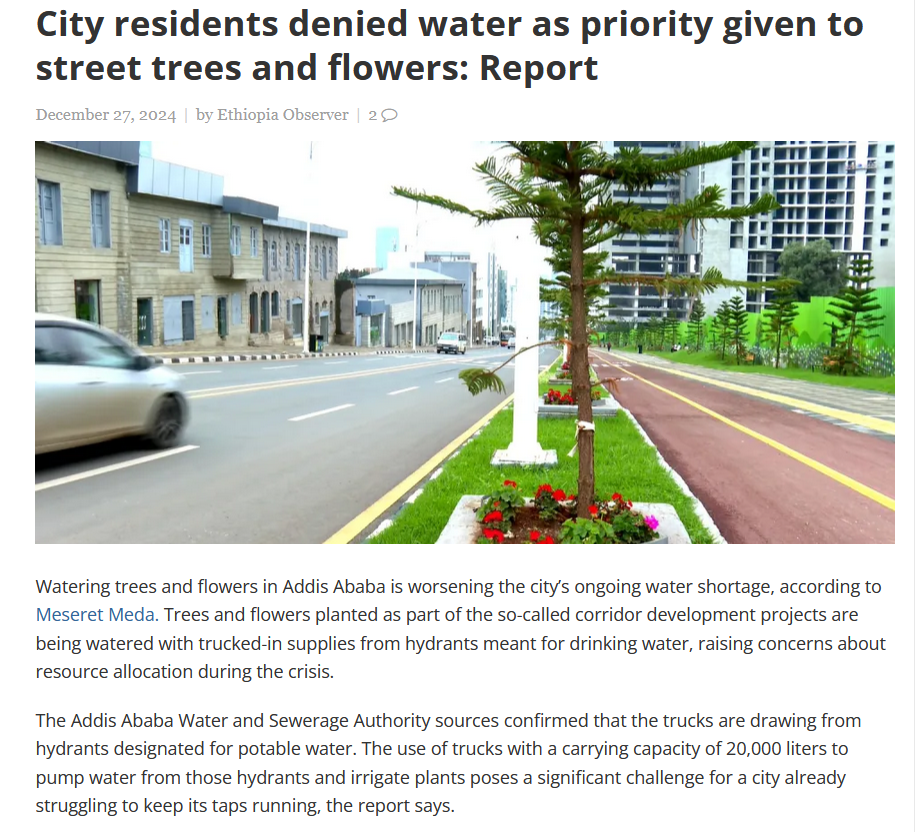 Watering trees and flowers in Addis Ababa is worsening the city’s ongoing water shortage, according to Meseret Meda. Trees and flowers planted as part of the so-called corridor development projects are being watered with trucked-in supplies from hydrants meant for drinking water, raising...
