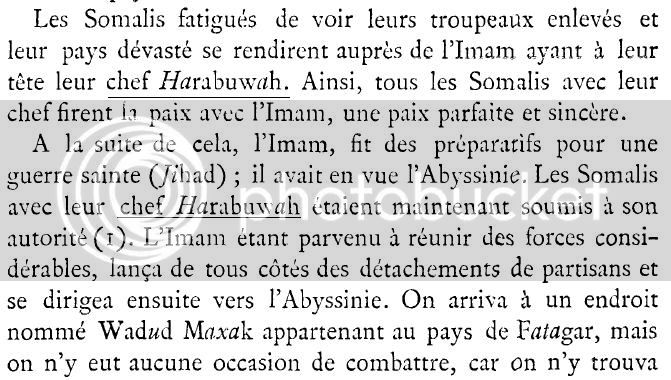 "The Somalis, weary of the destruction inflicted on them went to the Imaam (Imaam Axmed), led by their (chosen) leader Hirabu. The Somalis with their leader concluded a complete peace with the Imaam.