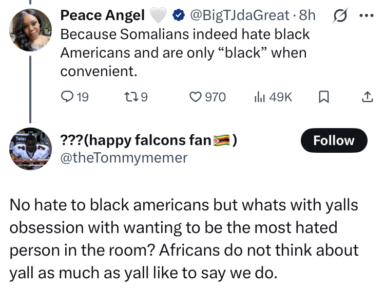 After this past year I don't think I'll ever give a shit about what a non somali black person thinks about us for as long as I live