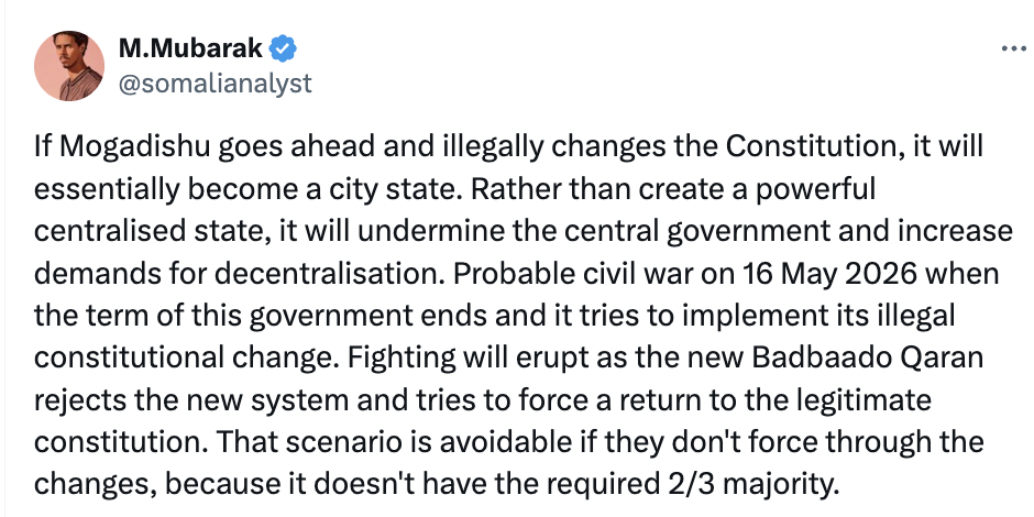 I don't know who this man is, but I agree. Mogadishu will lose more and more relevance with everyday that HSM is pushing these changes. There will be a parallel government at some point, don't be shocked when Garowe is announced as the interim capital or I suspect, it will be Gaalkacyo.