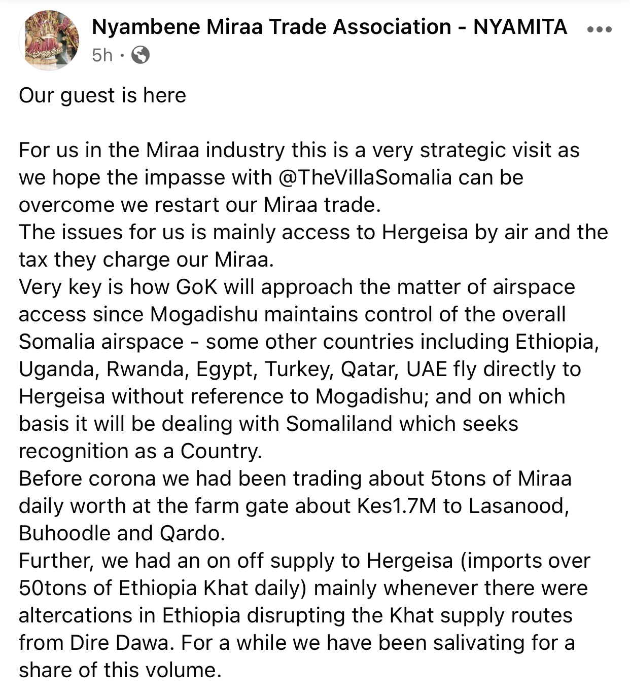 This is not why Somaliland is there. The only places that consumes Mira in Somaliland is east sool and east sanaag harti-darod communities and they are 5% of the country population
