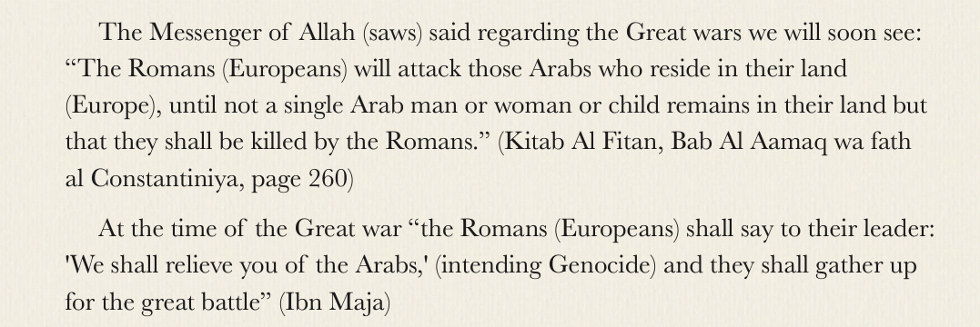 There are hadiths saying the banu asfar (Europeans) will go to their leaders saying let us handle these Muslims for you, and that Muslims and Arabs will be slaughtered in the lands of Europe, man woman and child. :damn: