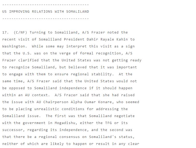 Because, as Wikileaks shows, government went about it the wrong way. Instead of pressing for a time frame to include Somaliland case in AU agenda headed at that time by a president more accommodating to your case, Kahin went ahead with standard "begging for recognition" route.