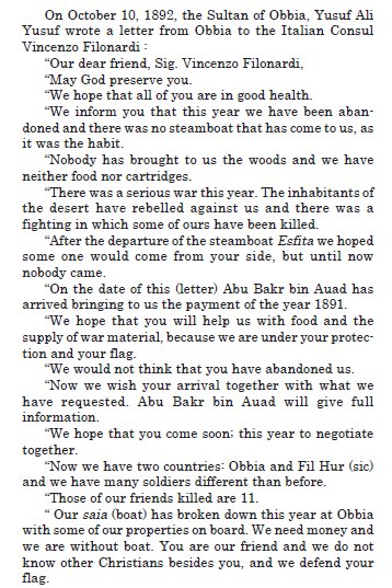 What is wrong with that letter saxib can you elaborate, from my perspective it is anti-Italian and anti-colonization letter to the UN mission to the trusteeship given back to Italy after it was defeated in world war 2. It is using diplomatic language of that time, the elder who wrote that letter was not only high IQ but a very good politician.