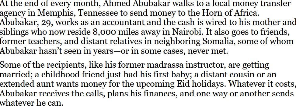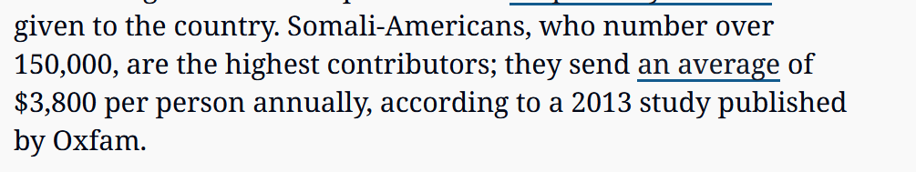 Remember the quote I shared earlier? Do you really think Somalis could send $3,800–$5,000 each per year back home while earning poverty level wages?