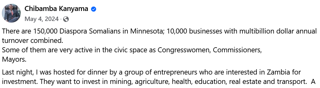 The Somali American business class regularly meets with international/Somali entrepreneurs to invest in East Africa, showcasing the substantial economic resources and outward investment capacity of the community.