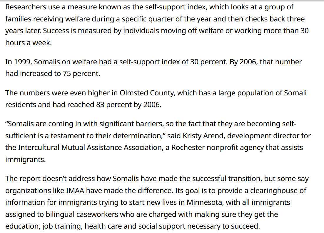 Also, @Atoosh mentioned welfare/government assistance. The truth is that most Somalis in America are self-reliant, with a self-support index of around 80 for over two decades.