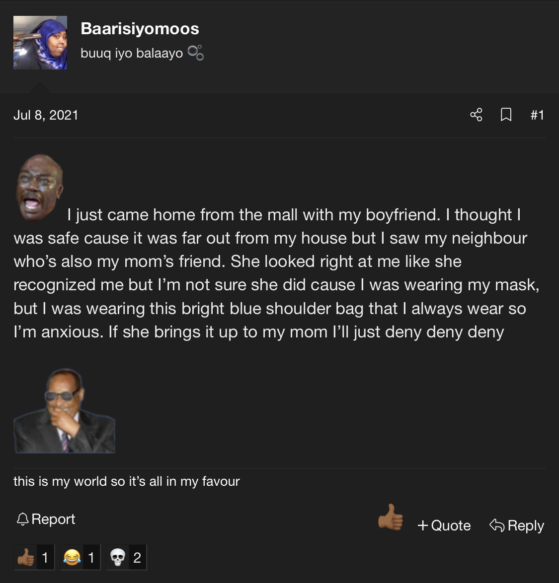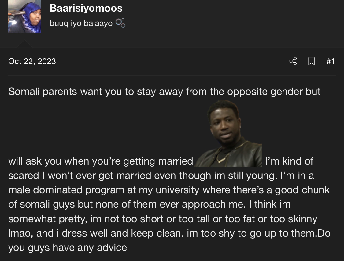 @HIBAQ123 said we Somali “men” are getting cucked out of existence apparently because of somali women like her wanting to marry out.