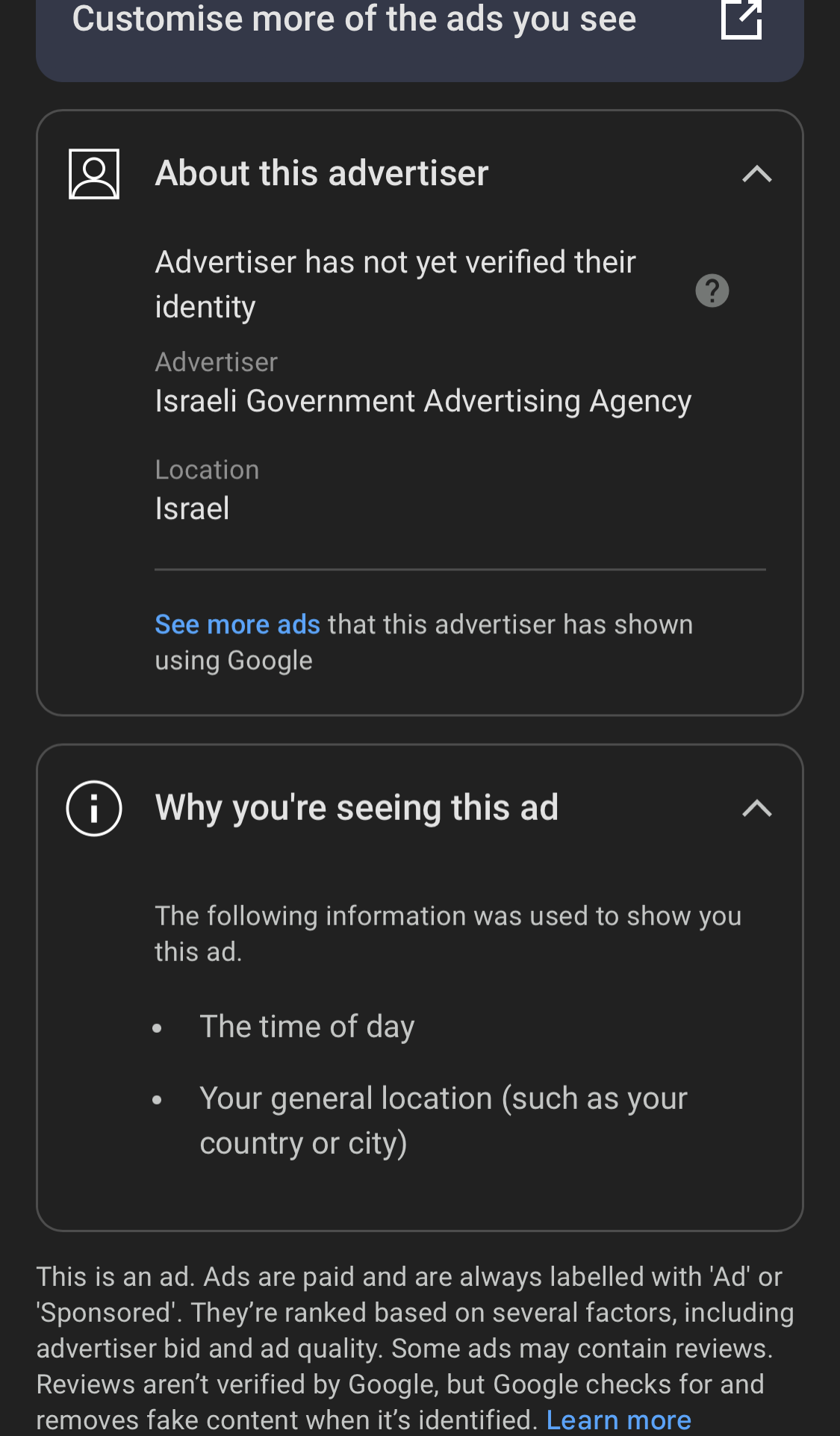 Either way is anybody else getting isreali ads on yt. I have my ads targeting off so the ads im getting are for the general population.. Whats crazy is their using new footage that happened yesterday. The propaganda is quick to act it seems.
