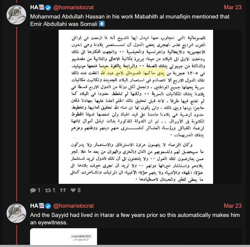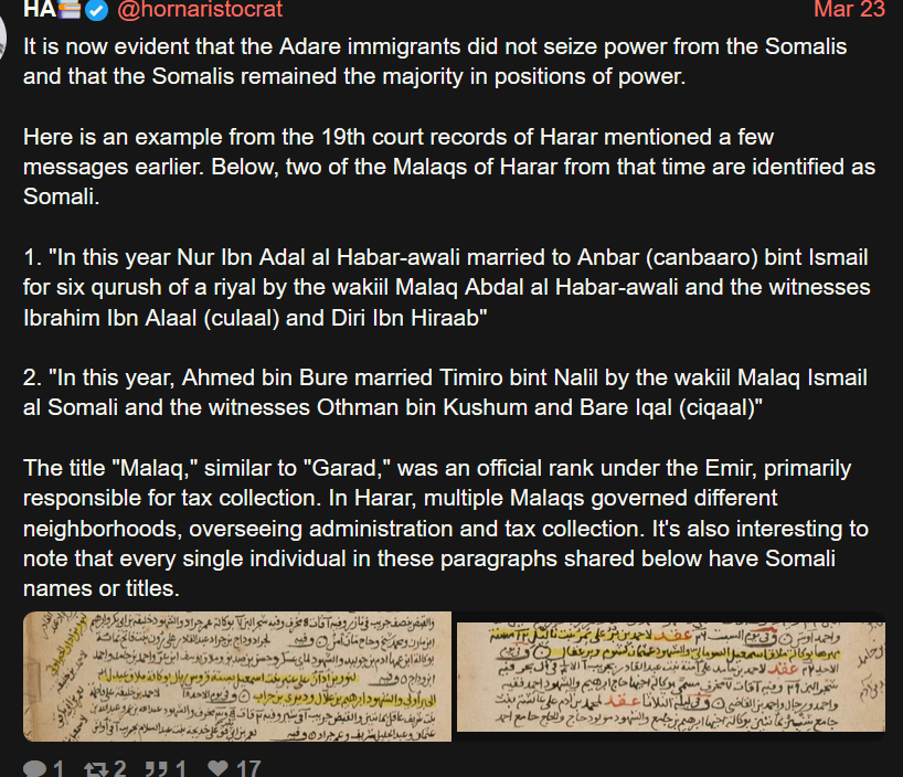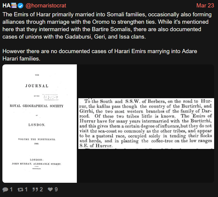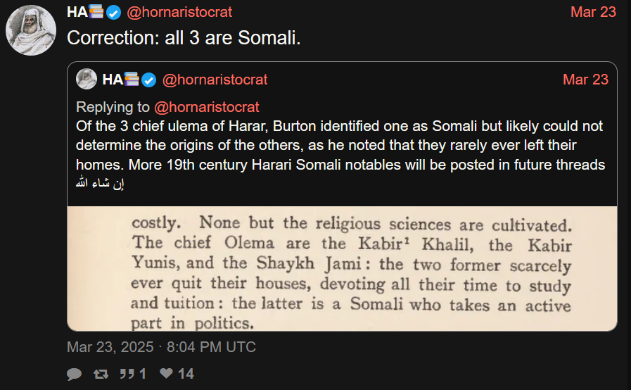 To be honest, I’ve only come across a handful of Somalis who are truly honest when it comes to history. For example, I had a Somali man from the Darod clan tell me that Shaykh Abadir was Marehan Darod, and that all Hararis and most Oromos are Darod and all Harari amirs were Darod Marehan. That’s just not grounded in fact—it’s ridiculous. Another Somali girl from the Dir (Samaroon) clan claimed that Amir Nur was a Dir. These kinds of claims vary so much, even among Somalis themselves, and that creates a lot of confusion. You seem like a good guy, but I’ve learned I can’t just take Somali claims at face value—I have to do my own research, or our history ends up being claimed by others.