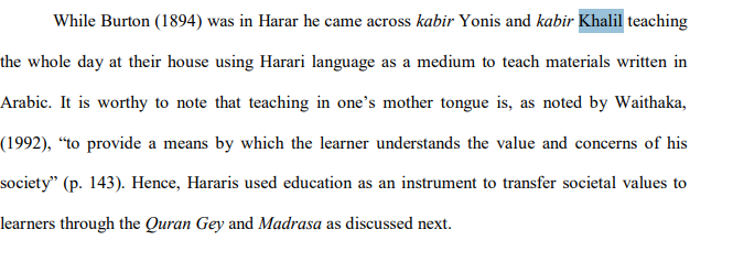Burton clearly notes that they taught from their homes, used the Harari language, and were separate from Shaykh Jami, whom he specifically identified as Somali. Although Burton met both Kabirs, his actual communication with them was limited. Most of his interaction was with Shaykh Jami, likely because Jami was more involved in regional politics.