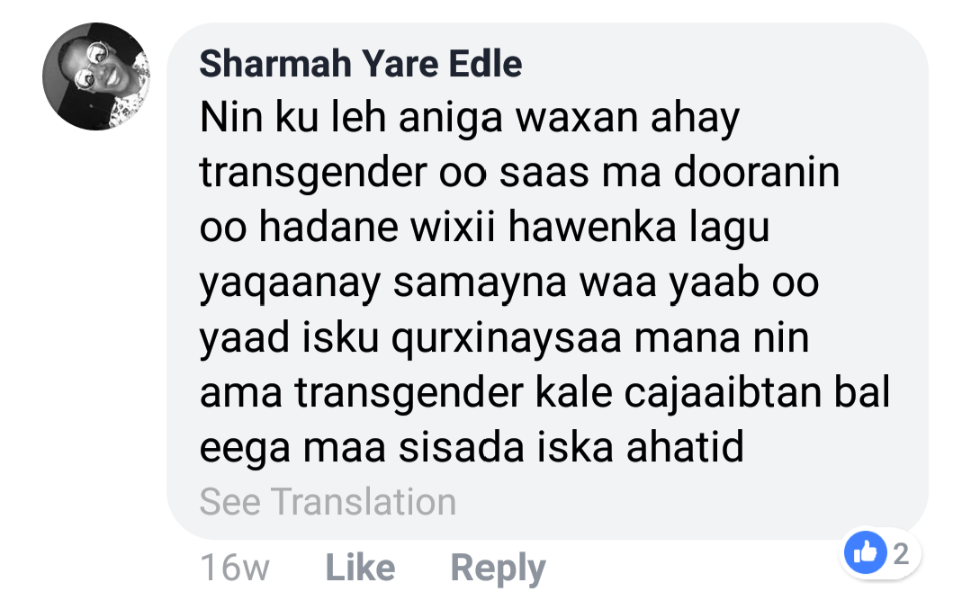 Bro we are Somalis and Alhamdulilah 100% Muslim. We cant have filth like this influence the younger generation. Imagine a man cross dressing becomes normal in a couple of generations amongst Somalis? Thats upon us then, we can clean this filth now, its not too late.