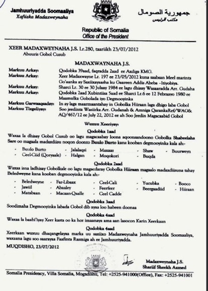 The story behind splitting Hiiraan into 2 was honouring Sheikh Sharif’s Presidential Decree as he named Upper Shabelle with its capital as Bulo Burte and Hiiraan as its capital as Beledweyne on 23 July 2012. This was before the constitution was created.