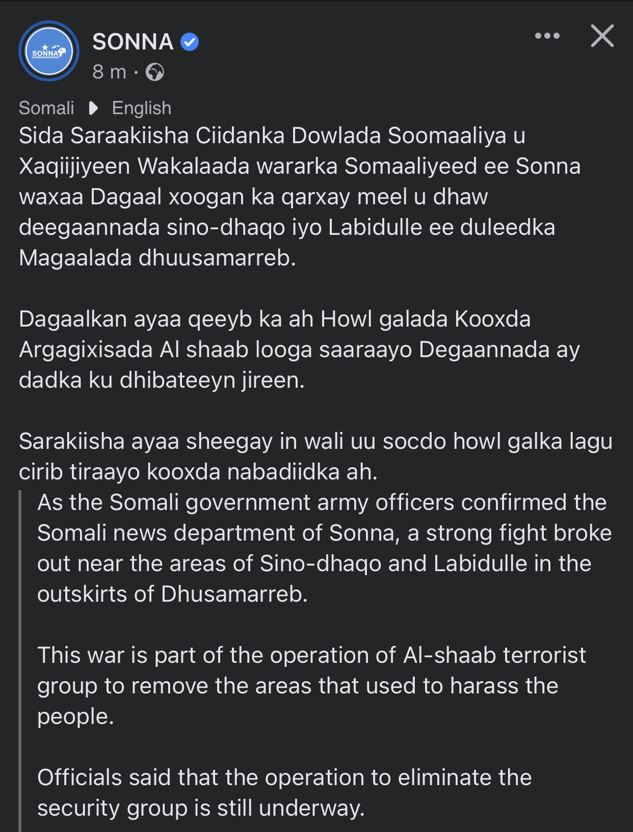 Fighting in areas between Ceel Garas and Sina Dhaqo