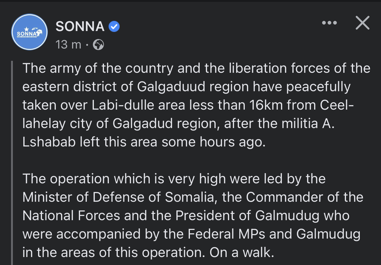 It’s two sides tbh. The Saleebaan front isn’t starting soon. Till Shabaab scatter from ceelbuur and go north.