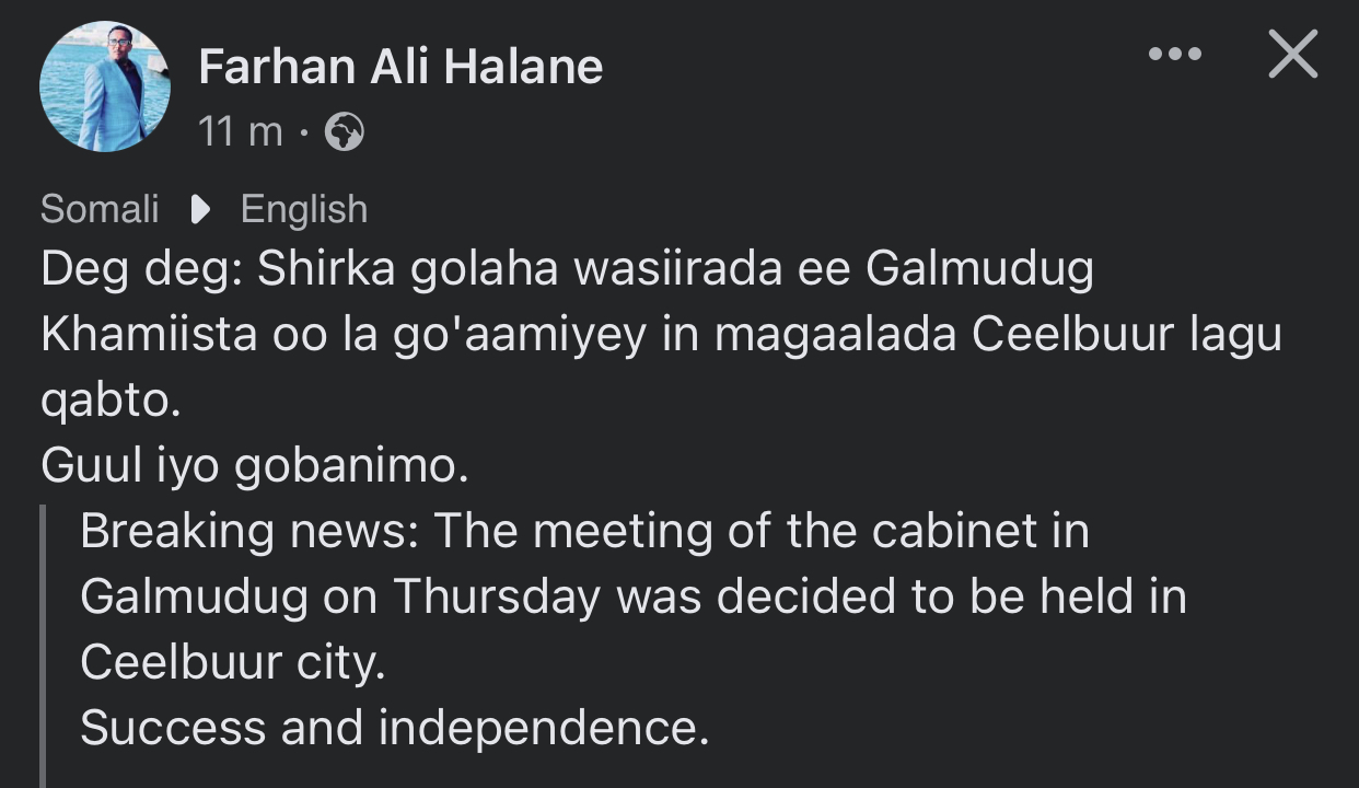 Yes the operation has been stopped by Qoor Qoor because clan militias are directly challenging SNA and Galmudug State forces orders and demanding more weapons.