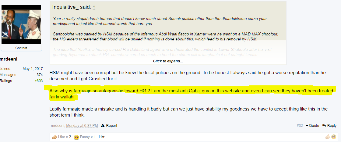 What exactly you seeking to proof from that post? it was in response to your fellow MrDeeni question who himself admitted the Farmaajo admin was Anti HG, despite he himself being the uncle of Farmaajo as well in his own words he prefaced his statement with being "the most Anti Qabiilist" guy.