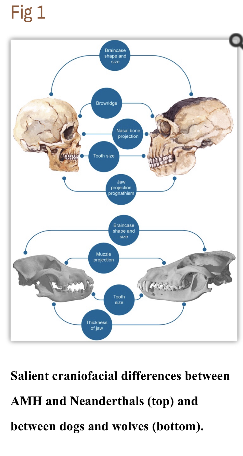 Think of dogs as juvenile wolves that never escape their immature state. Wolves as pups are playful, attentive, obedient and basically have all the traits we associate with mature dogs. But as they grow up they shed all these traits that are actually meant for learning survival skills from the parent and become mature wolves. This maturity entails a physical but also a mental change as to better survive in the wild. The early human skull from South Africa that I posted earlier for example had a brain capacity a fifth or fourth greater than humans today which is a trait almost all early human skulls share such as Jebel Irhoud, Herto man, Florisbad and Skhul/Qafzeh etc. A prominent change in domestication syndrome is a reduction is brain size, among other things.