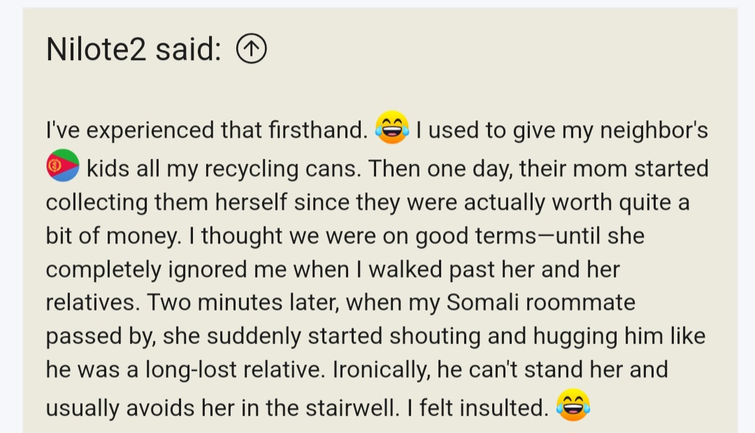 I just don't see East Africa as an ethnicityβit's a region. Am I not allowed to voice my opinion, or should I just remain silent when people use loaded language, I eventually think I saw a send them back to Congo comment. It's funny how you're so upset by my comment, yet you completely ignore all the other bullshit that's posted.