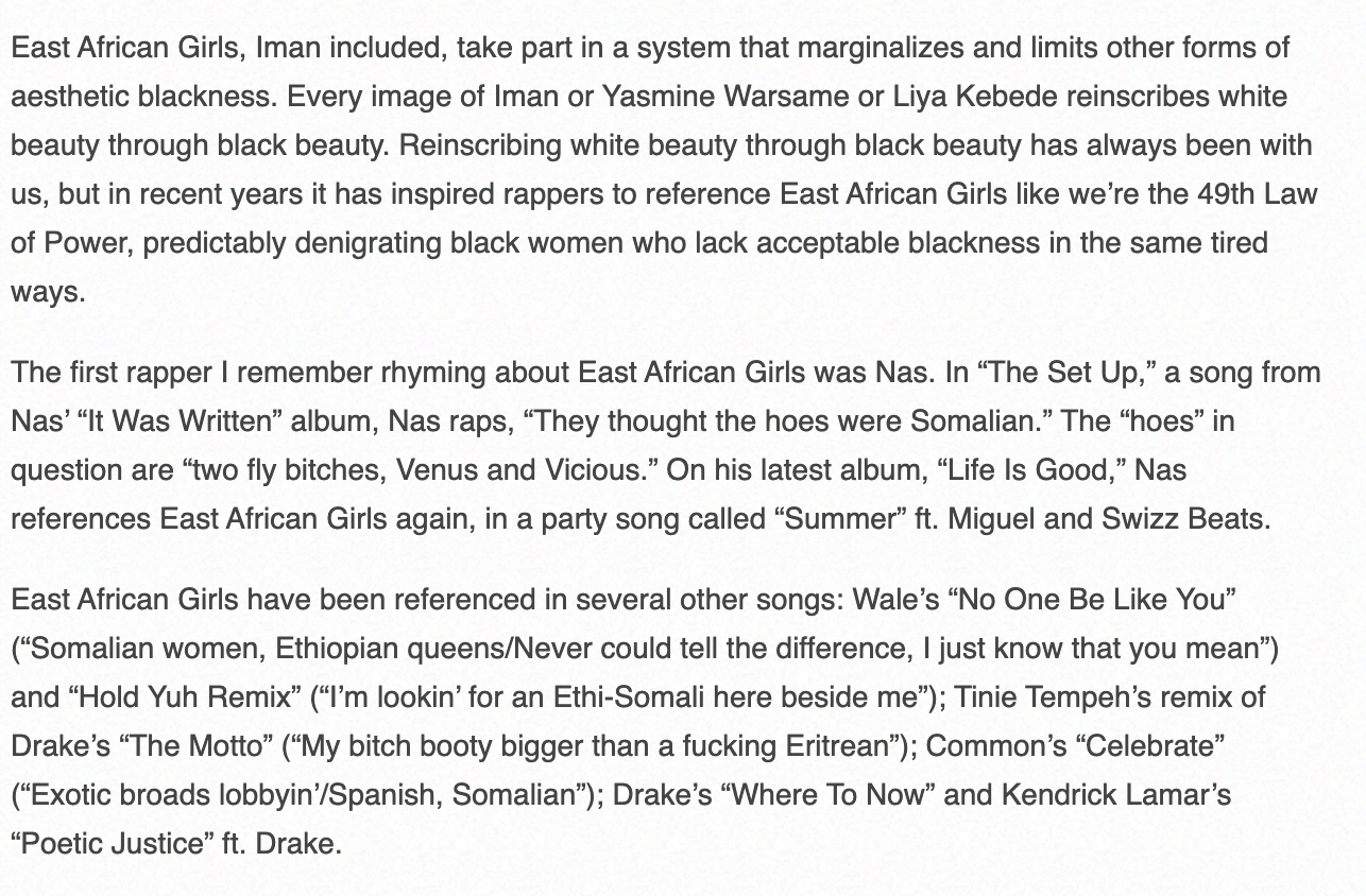 This article excerpt discusses how Somali and other Cushitic women are fetishised by rappers. I am convinced that this helped increase the 'East African girl/culture/people' nonsense on social media.
