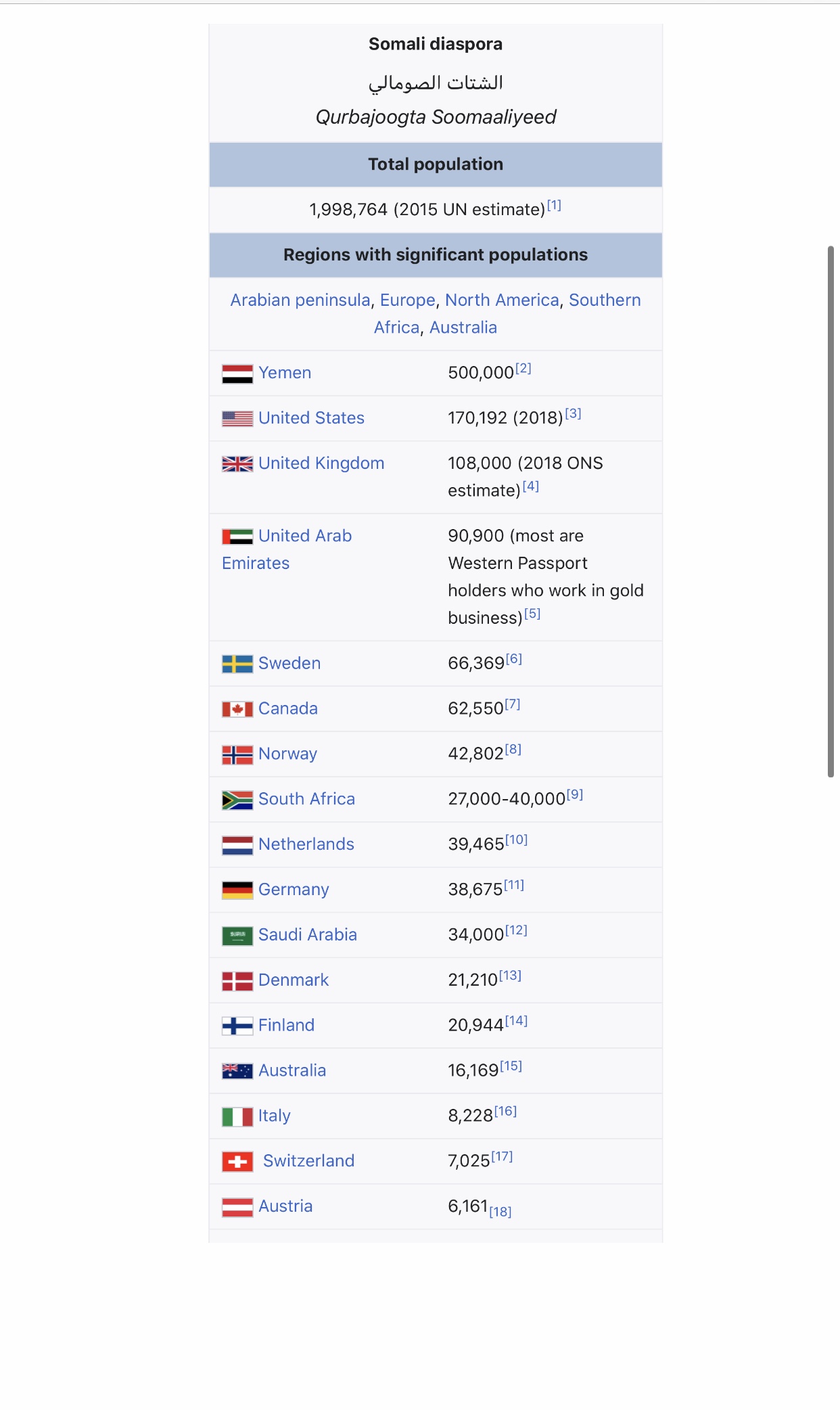 these are the official numbers, so we were bound to land in one of these when our parents fled somalia/land, with the probabilty being higher at the top. the numbers look off tho, the UK seems way too high, and the US too low. Canada as well seems low, i felt like somalis were legit everywhere back in toronto, more so than london tbh, but then again london is a huge place and i havent been everywhere yet.