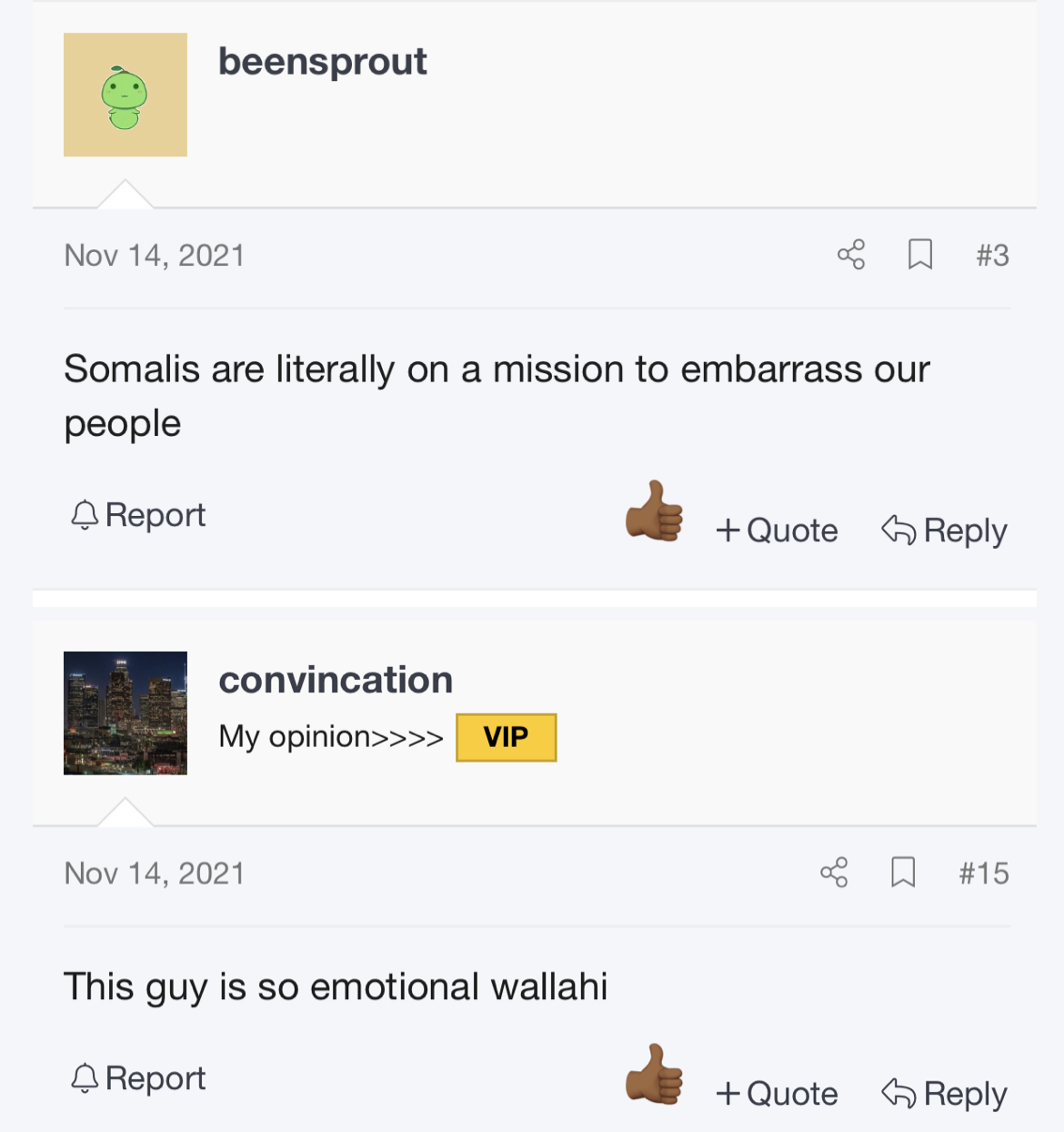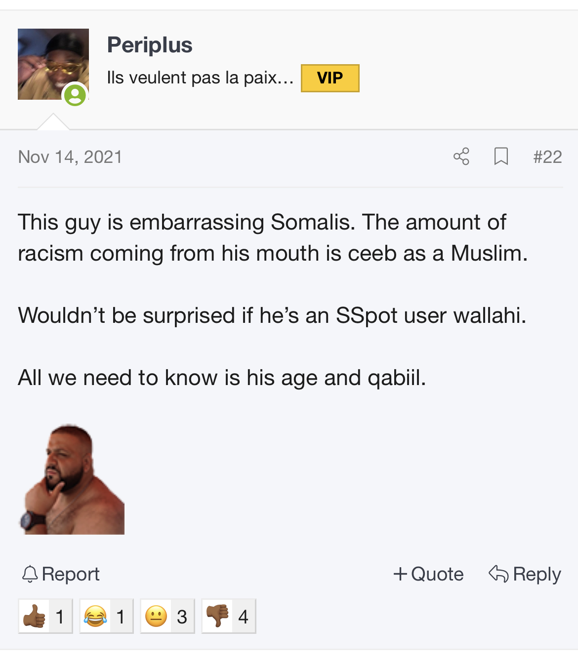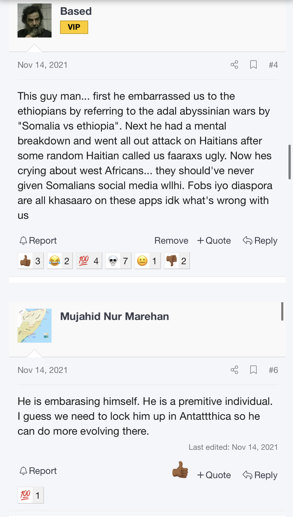 Sxb in the post right after the post you screenshoted here you said you don’t solve racism with racism. This isn’t right in my opinion the guy insulted us and he insulted back. You went full defensive mode in the thread linked but wouldn’t acknowledge that the Haitian guy started it justifying the Somali response that’s why people got heated