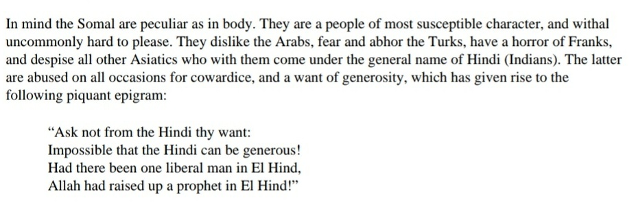 The book also details how Somalis have a general dislike toward Arabs, a hatred toward Asiatics like Indians but a fear toward Faranjis and Turks, rofl.