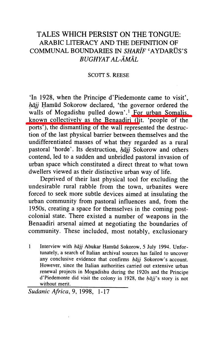 Your refutation actually supports my original point lol. The walls were brought down by the Italians, which allowed the influx of Somali nomads to enter the city. Before the walls were brought down, the Italian colonial regime collected the population of Mogadishu. They researched and studied the clan structure. They managed to record people based on their clans and identity. The documents show Benadiri was the majority.Your own sources identify Benaadiri as Urban Somalis.next this man will claim Siyaad barre was Harari and somalis were mere Nomads in used as canonfodder to liberate harar.