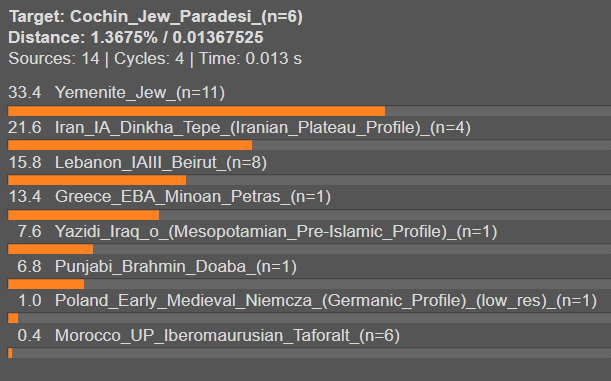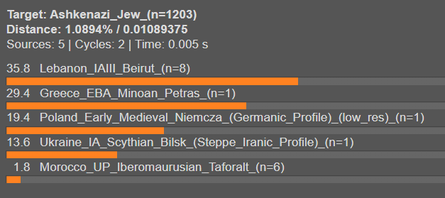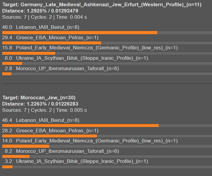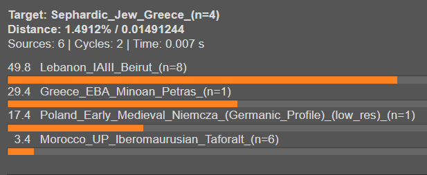 I disagree, man. I have modelled those guys before, and they barely cut the 50% at highest and usually were in the 45% range, where some 10% of that is non-Jewish. When you remove the Greek influence, the fit is increased heavily. You have to remember the MENA in Greek which is Anatolian (not only the Levant: edit for clarification). Ashkenazi, like the other Jews, have considerable Anatolian Neolithic affinity. These guys turned out to be higher Greek and lower European proper. In the past, these people tried to hyper-concentrate things into Central European genetics to section off European ancestry, and this enriched the Levant factor, but it is a false modelling. Remember, these guys lived many centuries among these Greco-Romans and somehow, across that Sephardi and Ashkenazi line, got the same Minoan levels, and these are supposedly from the same pool; it checks out.
