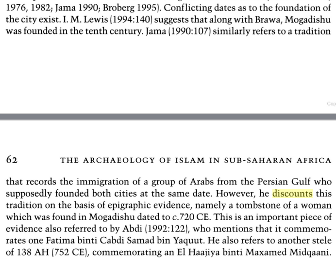 There is other evidence that ethnic Somali clans founded the city too like the oldest graves being Somali or Greco-Roman sources outright talking about Somalis living in the Mogadishu area.
