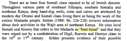 I have heard of the Madanle and the Tiiriyaat people who were once inhabitants of Somalia. Thw thing is they are usual described as Pre-Somali peoples but this the first i have heard of them being of Hebrew origin and i have heard alot of Oral accounts of Somali History