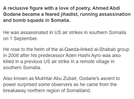 Somaliland Minister of Interior Ali Waran-Ade and other senior political, military, and business leaders including former ministers Mohamed Bihi Yonis, Hirsi Ali Hassan, and Suleiman Esa Ahmed as well as Colonel Muse Bihi Abdi and Abdirashid Duale, the CEO of Dahabshiil have actively financed and supported al-Shabaab as part of a strategy to undermine political and security progress in Somalia and boost support for Somaliland recognition.