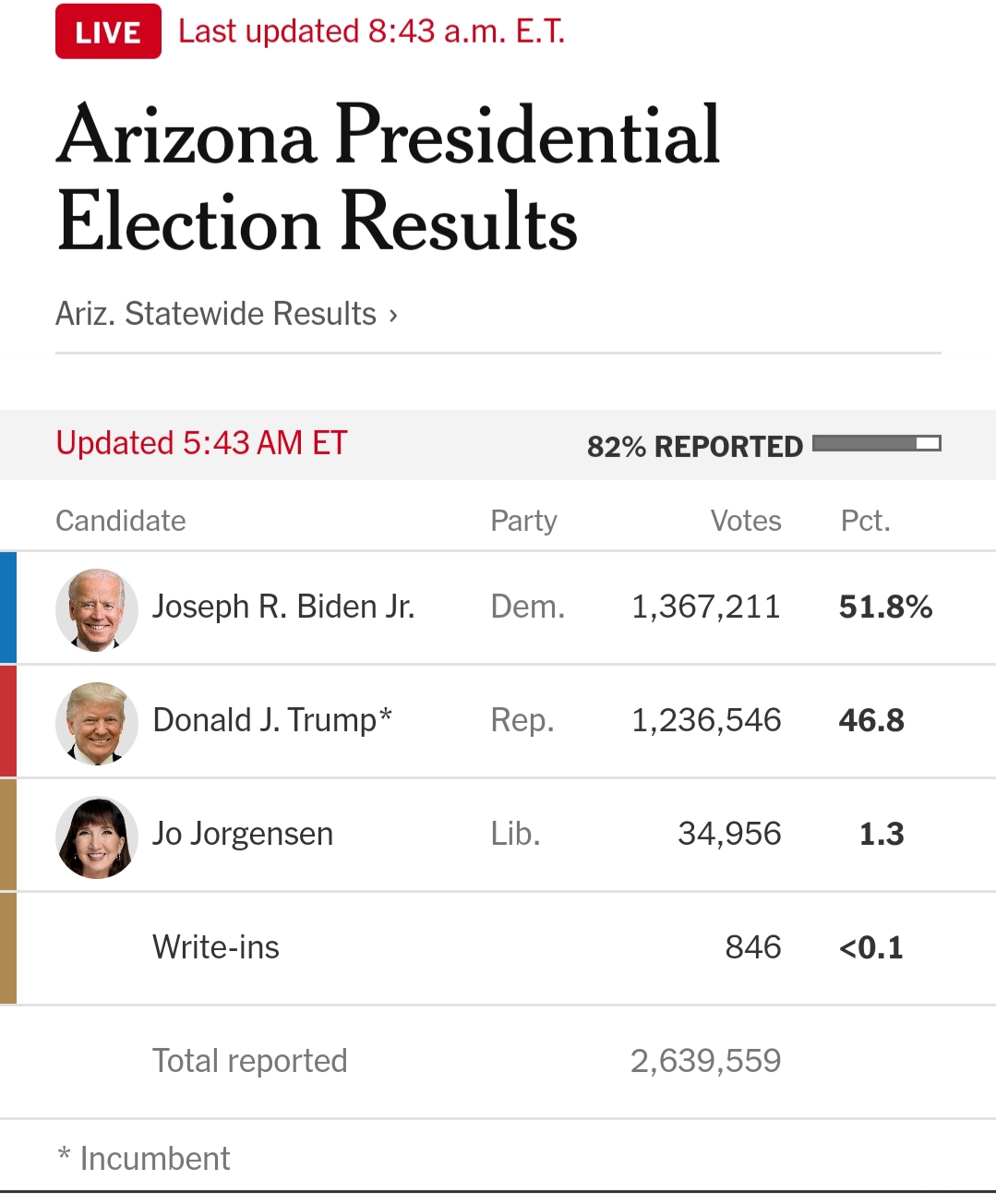 At this 2,640,000 votes have been counted (82%). Biden is leading by a mere 130k.