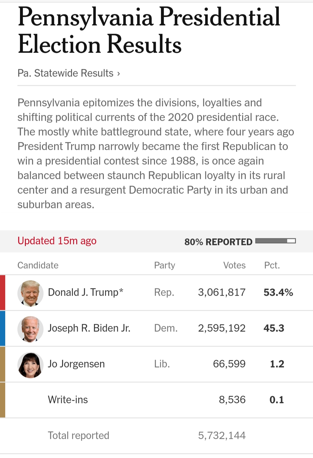 20% of the votes still remain to be counted that's 1,146,000 votes up for grabs. I think Biden has a good chance of flipping Pennsylvania in his favour just like he did with Michigan. View attachment 150712