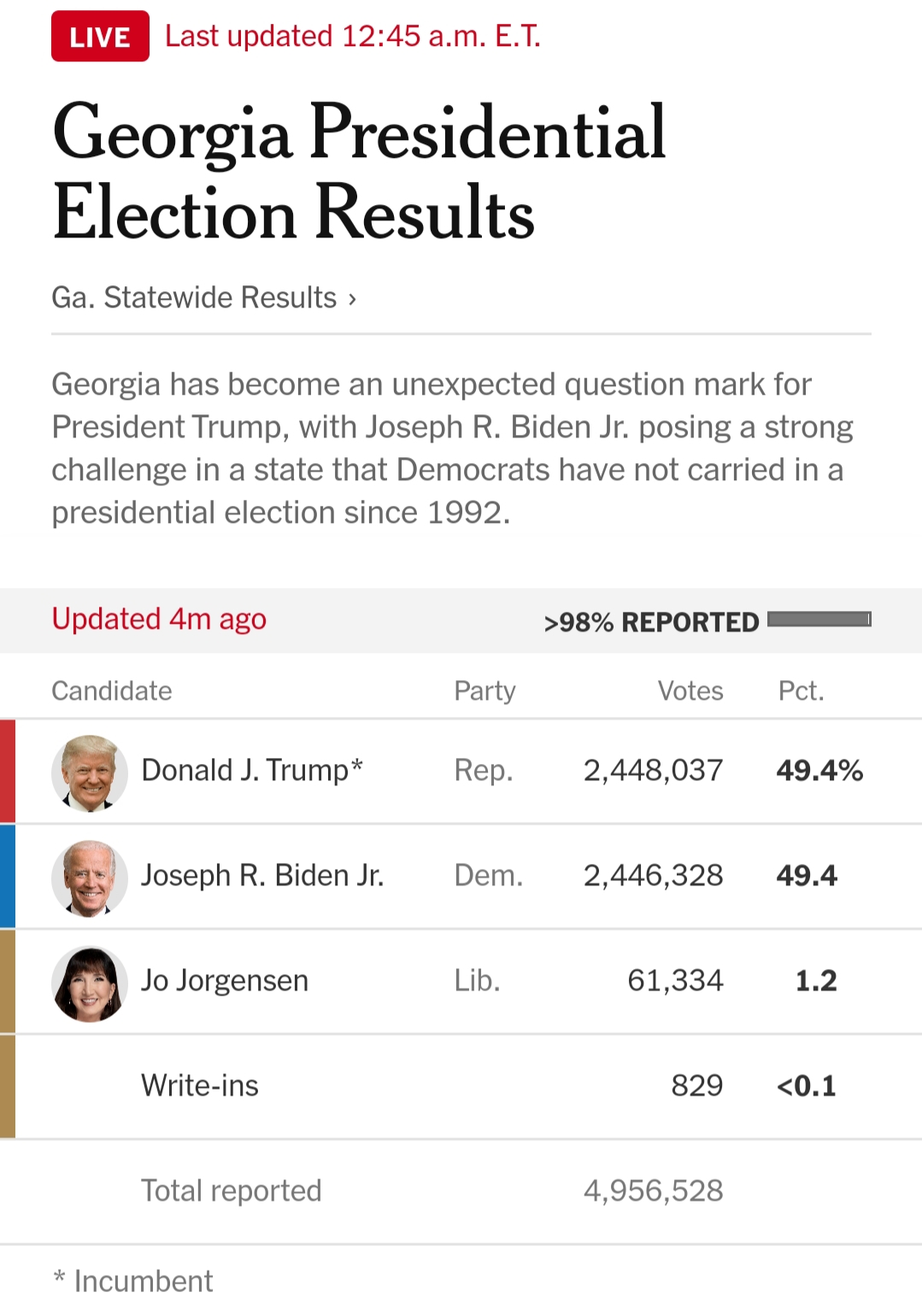NYT: We just received 541 additional votes from Georgia. Trump is currently up by 1,267 votes.