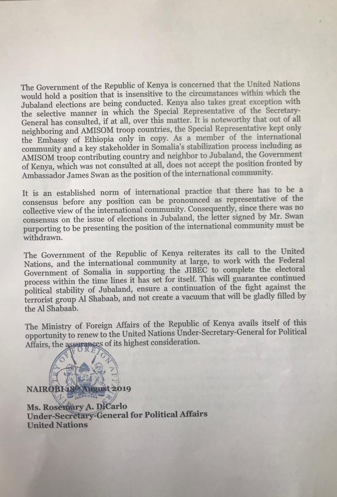This is diplomatic immaturity at its finest. They exposed all parties that have sided with Kenya over the FGS. These are people in which loyalty to their nation is of no importance and thrive on instability. It's embarrassing that these former transitional "Presidents" have become part and parcel of the petty opposition like Shakur. It's also dully worth noting that Kenya has the audacity to call into question the credibility of the UN Rep to Somalia. Their motives have become clear as day and should send a chilling message to all Somalis that are concerned about the sea dispute that is ongoing. Their close relations with Madoobe and the backchannel intel that has repeatedly confirmed him being a proxy of theirs makes him a Top National security risk. Him being removed is all but certain at this point.