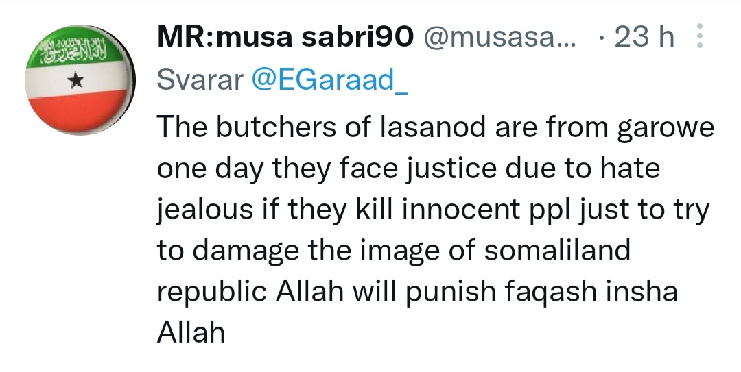 This is a reason why Somaliland as an independent state is not viable. Such a state would be, from its birth, opposed to the continued existence of Harti within its borders. The next step in this logic is ethnic cleansing. Think of the Nuer in South Sudan or Western Tigray.