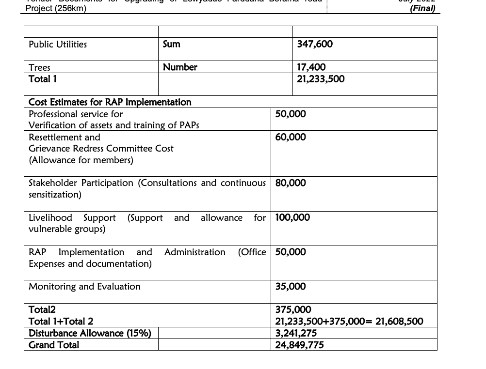 Yes, project was approved for like 58 million. It seems weird spending 25 million buying up properties and land before construction even begins. Thats half of budget. Galdogob to Garacad I think is very close to the length of this project and it was estimated 200 million for asphalt roadThe feasibility study has already been completed