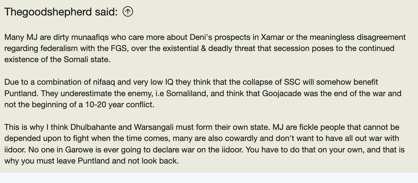 I have high regards to someone who doesn't lie about their clan and hates us since it's a wide known thing that most Somalis hate MJ. His envy and hate won't get him anywhere. This hate and envy will only push Puntites to not associate with Southerners and Northerners. I donβt have anything against Dhulbahante. Heck my grandfathers mother is Hassan Ugaas. Waxaanu nahay gacal iyo xigaal.