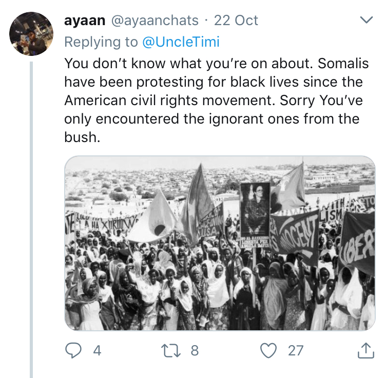 @Factz, there were other respondents who don’t speak in that one. World likes to use one quote or tweet and act like all Somali girls are like that. Her tweet was in the minority.